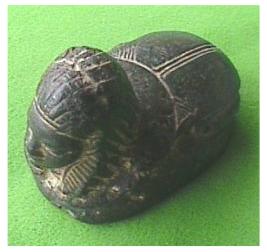 � Morphology of the scarab: nothing too outlandish here, if one ignores the sphinx head (of which more below). Where one would expect the drill hole in a typical scarab there is a notch that suggests such a hole, which is curious. The V notches on the wing-case, marking the �humeral callosity� or shoulders of the bug (which are an indication of post Dyn. 18th date on genuine scarabs, see Tufnell, Studies on Scarab Seals, Vol 2) are hatched. Hatching in this location seems to be very rare on the real thing but popular on larger faux scarabs. The base below the legs is thick, giving a heavy paper-weight like appearance to the piece. Where legs are shown in scarabs the base beneath them is normally thin in relation to the beetle as whole, usually little wider than the width of the legs themselves.