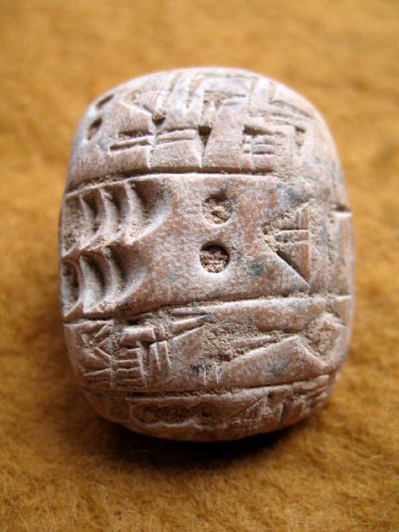 . 9.30. o (N) A double sided fragment from an UrIII administrative tablet which lists amounts of barley , textiles , pig feed and possibly ewes (part of the writing missing so not possible to be sure) disbursed to a person called Daga; but is particularly interesting in that the dating crosses over from one year to the next. It mentions the year names for Amar-Suen, years 6 and 7. 75mm. Although Amar-Suen succeeded his father Shulgi (2112-2004) and ruled as the third king of Ur III dynasty for a period of nine-years (2046-2038), little is known about him. He is not mentioned in economic texts that date to his father's reign, and the only documents that specifically mention Amar-Suen by name and that date to his reign are building inscriptions. The relevant year names are: 6a. mu us2-sa en-unu6-gal-an-na en-dinanna unuki-ga ba-hun Year after the year: "Enunugalanna was installed as en-priest of Inanna in Uruk" 6b. mu damar-dsuen lugal-e ša-aš-ru-umki a-ra2 2(diš)-kam u3 šu-ru-ud-hu-umki mu-hul Year: "Amar-Suen, the king, destroyed Shashrum for the second time and Shurudhum" 7a. mu us2-sa ša-aš-ru-umki ba-hul Year after the year: "Shashrum was destroyed" 7b. mu damar-dsuen lugal-e bi2-tum-ra-bi2-umki i3-ab-ruki ma-da ma-da-bi u3 hu-uh2-nu-riki mu-hul Year: "Amar-Suen, the king, destroyed Bitum-rabium, Jabru, their territories and Huhnuri"
