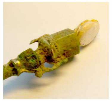 15th December Found another similar strange thing! This one is 134mm The top has the same hexagonal shaped green stone but it does not rotate. At the very top is a disc of mother of pearl which is secured by a wire which runs in a groove cut into the circumference.