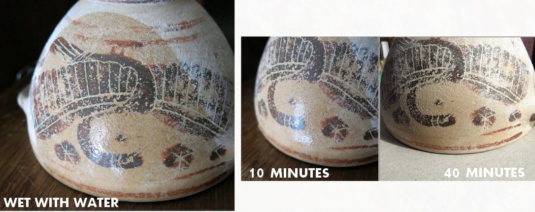 Are any of these fakes? A simple first test. Wet with water. Ancient pottery usually adsorbs the water exceedingly rapidly and in a very short time the surface will not betray any moisture