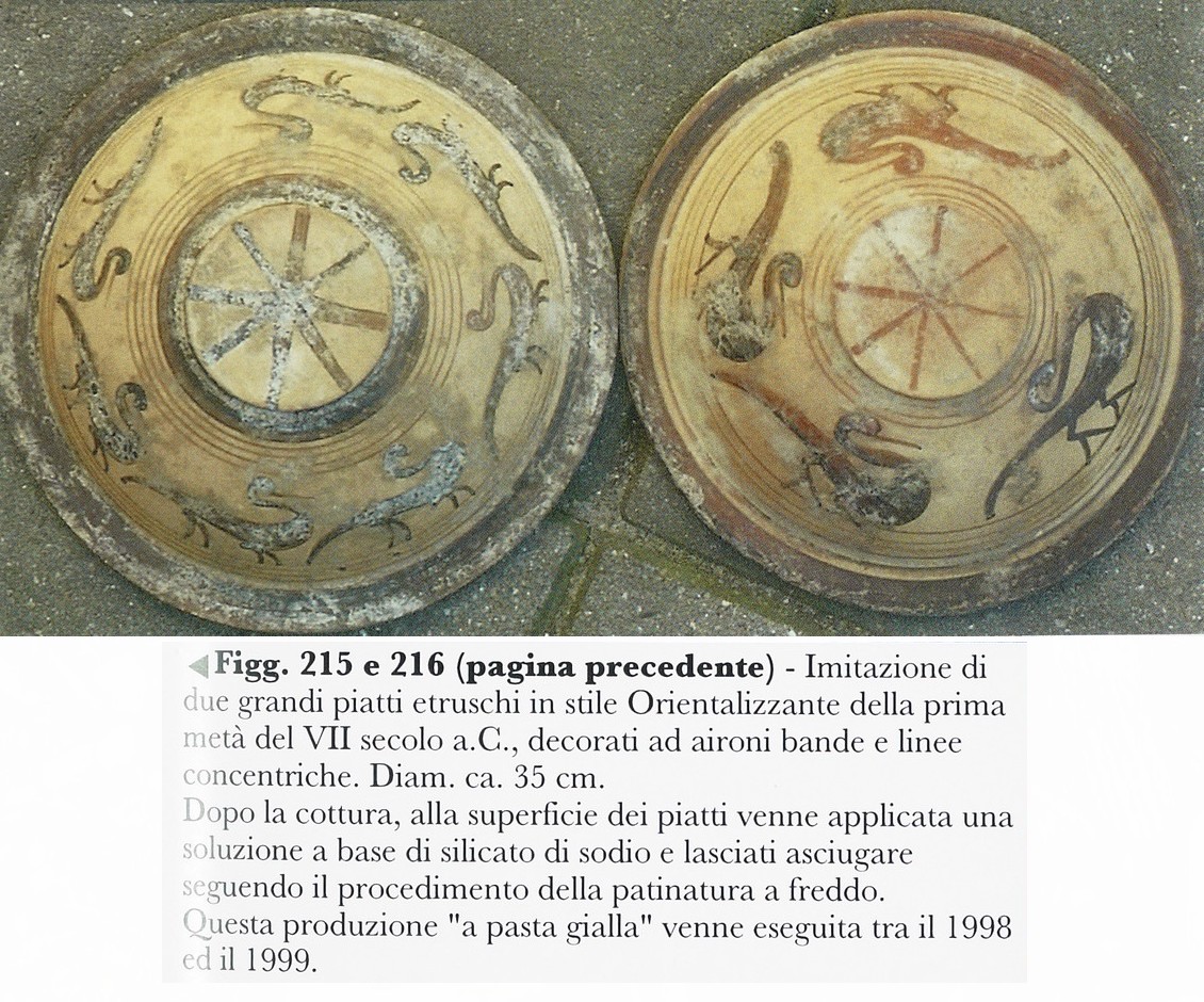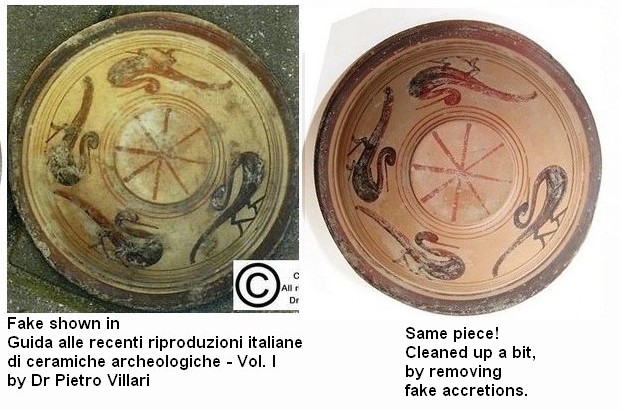 These particular fakes were made in Italy between 1998 and 1999 There have been a fair number of the fake pieces shown in Dr Villari's books which have appeared on the market sold as genuine. They were originally sold on eBay, many years ago, as reproductions. However at least two "dealers" acquired several and sold them on as genuine. These pieces were slightly altered before being put on the market again, either cleaned up as with this plate, or "distressed" by removing some of the painted decoration.