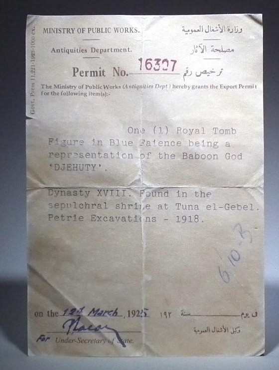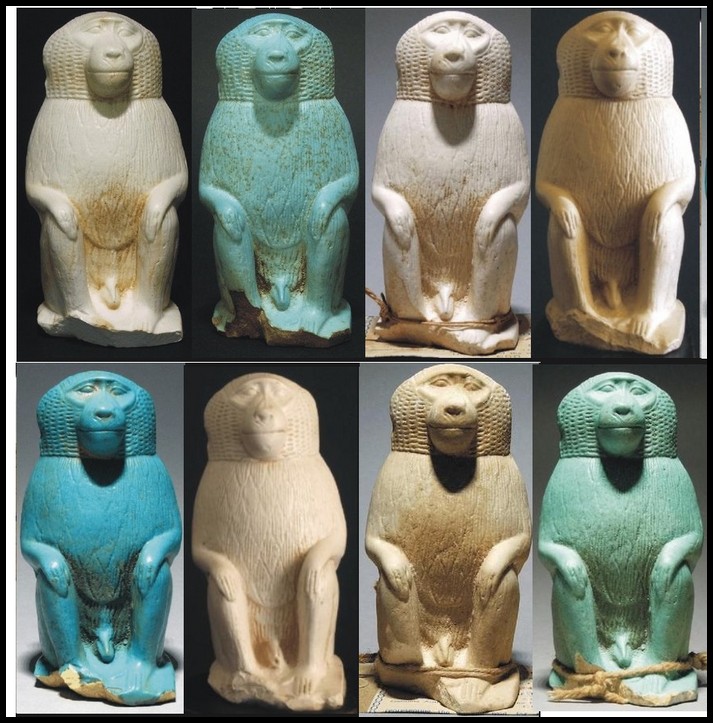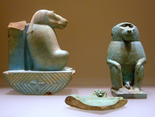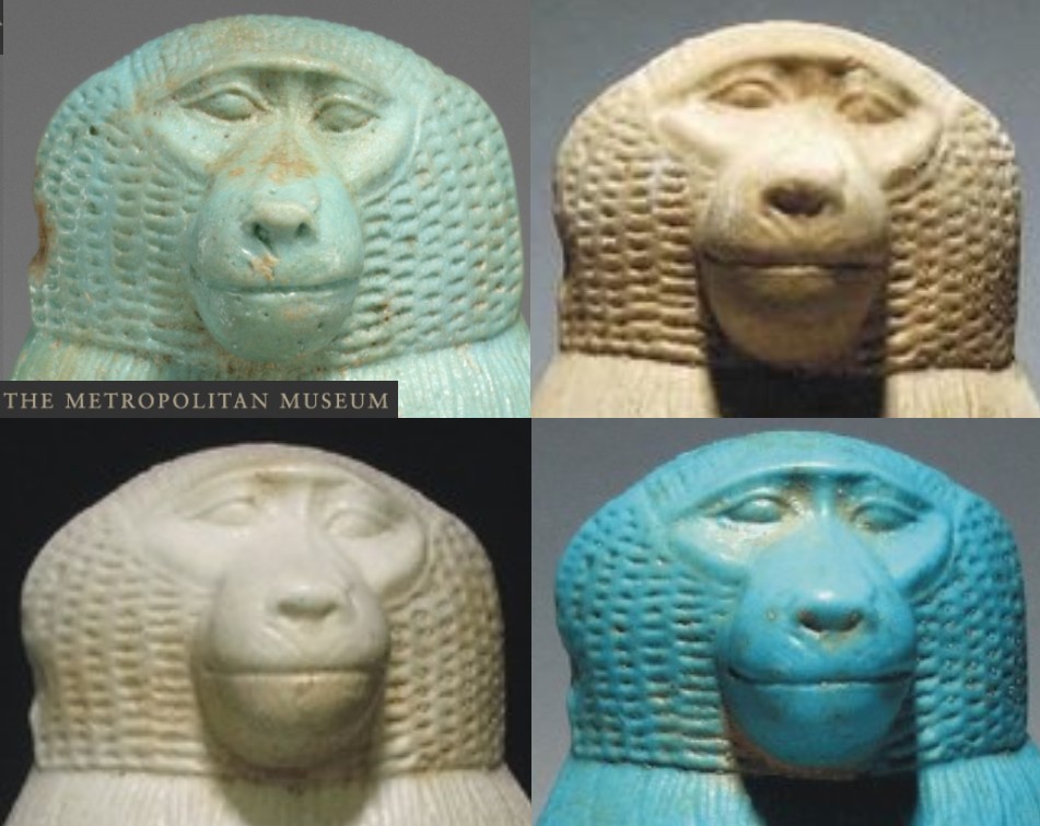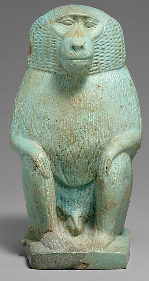 · Their piece: Figure of a Cynocephalus Ape · Figure of a Cynocephalus Ape Accession Number: 26.7.874 · Late Period · Dynasty 26–29 · 664–380 B.C. · Egypt, Memphite Region, Memphis (Mit Rahina) · Faience · H. 8.8 cm (3 7/16 in) · Date: 664–380 B.C. · Purchase, Edward S. Harkness Gift, 1926