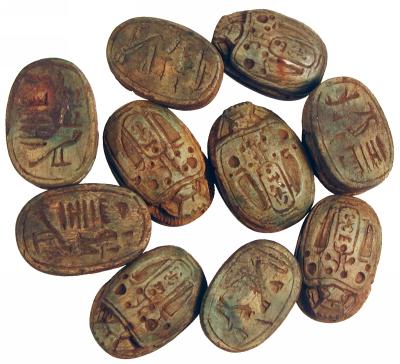 Sells scarabs nicely mounted as rings, earrings and pendants too. You may recognise the type of fake now.
