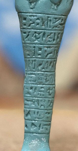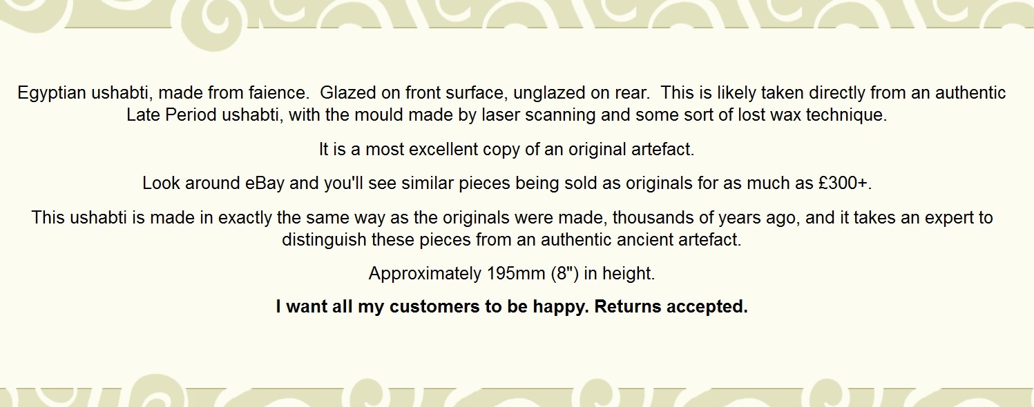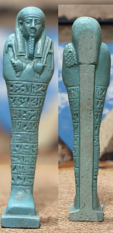 Be aware that there are fakes of this type of rather plain but fairly distinctive Late Period ushabti on the market. They are made from a mould taken from a genuine original but have been reduced in size.