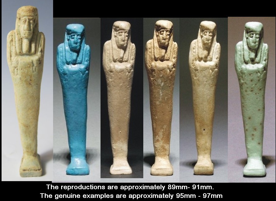 Come is a variety of sizes. The commonest found are between 162mm and 165mm There are less common ones both smaller and a larger. These are based on a genuine ushabti for Nes-ptah, Sameref Priest, born of Tayes-shepset-hert There are very few of the genuine one around. The vast majority of these are fakes. Some are quite well made, some less so.