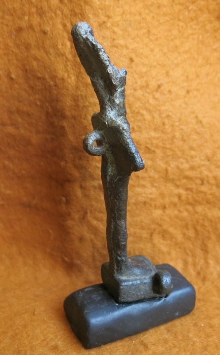 Osiris bronze figurine. This votive figurine of Osiris is 124mm high. He is wearing a double plumed Atef-crown with frontal uraeus, has a false beard, and holds crook and flail. The hands are level with each other which is the traditional pose for such bronzes made in middle Egypt*. He is on an integral base with a side loop attachment as well as the loop at the back. Beneath the base is an additional shoert peg. It reputedly comes from a very old collection and indeed the very dark almost black patina is consistent with this as in the
