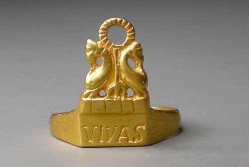 This fingerring is from a private collection Wiesbaden made like two dolphins, separated by a trident with a stylized laurel wreath on top. The bezel with the inscription ViVAS. Origin item in bronze, approx. 2-3. C. AD. Worldwide are only existing 2 rings of this type, one in bronze and on in silver found between Cologne and Neuss.