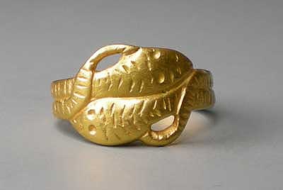 Description: Roman gold ring in the form of two intertwined snakes facing opposite directions. The snakes' details, including the scales on their skin and their eyes, are delineated through small incisions. The snake motif was very common in Roman jewelry. It was thought to protect against the evil eye